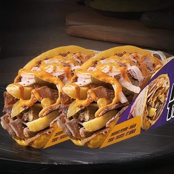 2 Adet Maytako (50 gr. et döner, tortilla lavaş, chedar peyniri, salatalık turşusu, patates kızartması, soğan, acılı sarımsaklı mayonez sos. Cin biberi ile)
